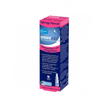 Snoreeze spray nasal es una solución que se aplica en las fosas nasales con el propósito de ayudar a descongestionarlas y reducir progresivamente los ronquidos que esto puede ocasionar. Su fórmula crea una película fina que libera constantemente los ingredientes activos. La congestión nasal puede formarse después de una inflamación de los tejidos producto de un resfriado o una alergia que bloquean el adecuado flujo de aire. Los ingredientes naturales del producto contribuyen a la desinflamación y lubricación de las fosas. El spray nasal cuenta con potentes ingredientes activos procedentes de la naturaleza como el aceite de tomillo, aceite esencial de lavanda, extracto de maravilla, glicerina y mentil lactato. El aceite de tomillo tiene propiedades antibacterianas conocidas, además de tener especial influencia sobre las afecciones respiratorias. Ejerce un conocido efecto sobre la congestión nasal y la tos. Al aceite esencial de lavanda, por su parte, se le atribuyen propiedades antifúngicas y analgésicas. El extracto de maravilla se usa para ayudar a aliviar los procesos inflamatorios. La glicerina se encarga de hidratar y lubricar la piel de las fosas y minimiza las molestias que pueden ocasionar las alergias y las gripes. Por otra parte, el mentil lactato es un ingrediente que se obtiene de forma natural y que posee efecto refrescante y calmante propio del mentol. Se presenta en formato de 10 ml para 25 aplicaciones.