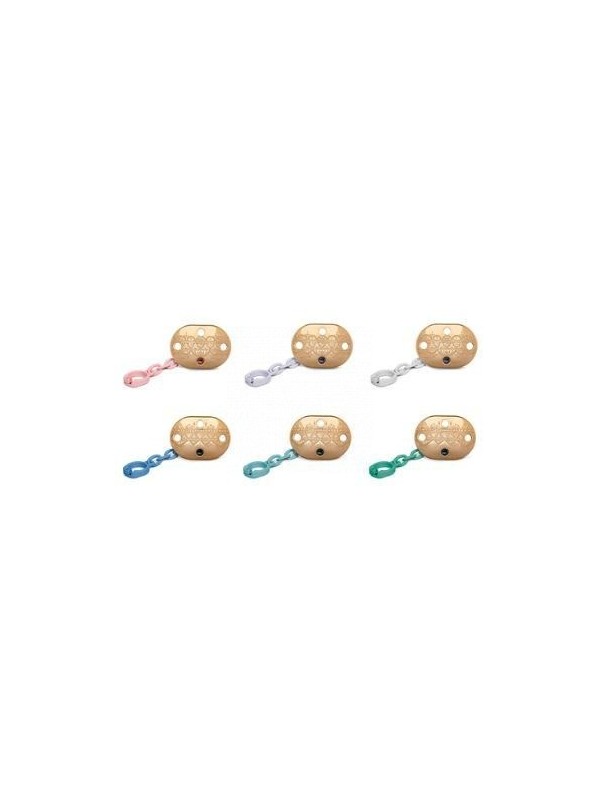 Permite sujetar el chupete a la ropita, evitando que caiga al suelo y se ensucie o se pierda.La pinza, que se sujeta a la ropa, lleva unida una argolla en la que introducir el chupete.Un complemento cómodo y práctico, además de ideal para lograr un conjunto único y con personalidad propia combinado con el chupete Haute Couture en tonos dorados.Disponible en diversos diseños a juego con los chupetes y biberones Haute Couture.