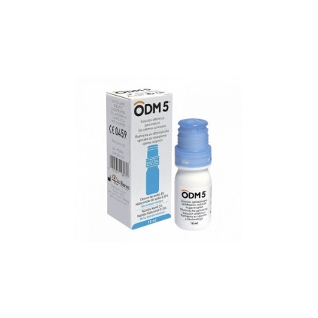 PRESENTACIÓN: Frasco multidosis de 10 ml sin conservantes. COMPOSICIÓN: Cloruro de sodio 5%, hialuronato de sodio 0,15%. Otros ingredientes: Agua purificada, citrato trisódico dihidratado, ácido cítrico monohidratado, hidroxipropilmetilcelulosa. ODM 5® contiene hialuronato de sodio, un elemento presente en el ojo de manera natural que, por sus propiedades lubricantes, ayuda a proteger la córnea. ¿EN QUÉ CASOS UTILIZAR ODM 5®? ODM 5® está indicado para reducir los edemas corneales: edemas ocasionados por distrofias corneales, edemas post-traumáticos y edemas post-quirúrgicos. Los edemas corneales se caracterizan por un exceso de fluidos en la córnea. ODM 5®, solución hipersalina, expulsa por efecto osmótico el exceso de estos fluidos fuera de la córnea, lo que permite recuperar transitoriamente un estado de hidratación normal. De esta manera, ODM 5® ayuda a mejorar su calidad de visión. ¿CÓMO UTILIZAR ODM 5®? • Lávese cuidadosamente las manos antes de usar la solución. • Instile 1 o 2 gotas 4 veces al día según las recomendaciones de su médico. Instile las gotas en el interior del saco conjuntival inferior del ojo, para ello, mire hacia arriba y tire ligeramente hacia abajo del párpado inferior. • Tras la instilación mantenga el ojo cerrado durante 1 o 2 minutos. • Evitar el contacto de la punta del frasco con el ojo o los párpados. • No requiere aclarado tras la utilización. • VÍA OFTÁLMICA.