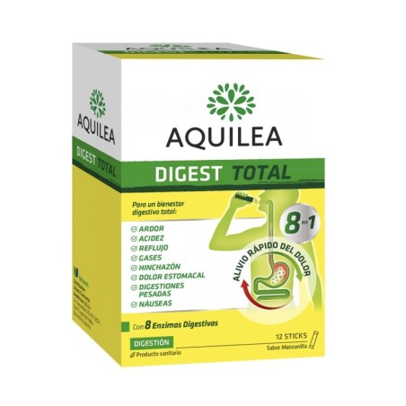 Quilea digest total es un multisíntomas que actúa rápidamente combatiendo 8 síntomas digestivos: acidez, ardor, reflujo, gases, hinchazón, molestias en el estómago, digestiones pesadas y náuseas. Todo ello gracias a una combinación eficaz de ingredientes y 8 enzimas digestivas. Además, aquilea digest total viene en un cómodo stick para tomar directo en la boca con sabor manzanilla.