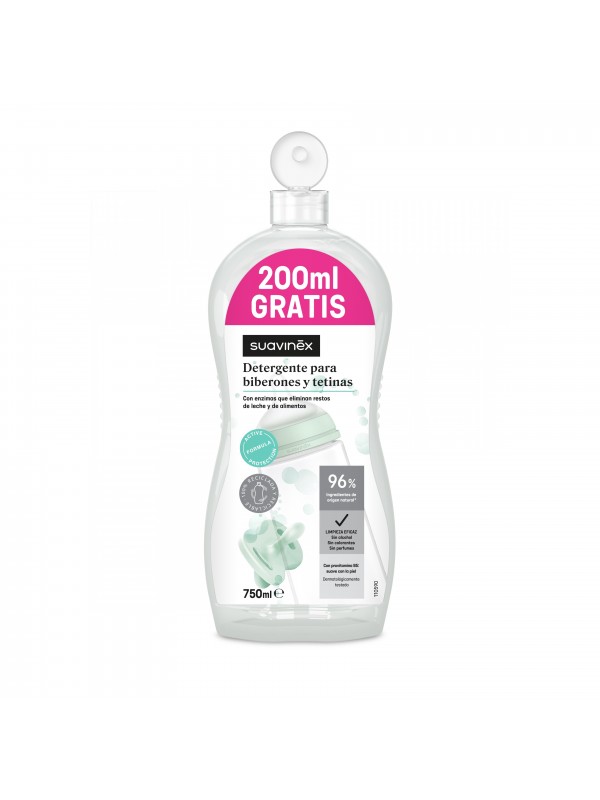 El detergente para biberones y tetinas de suavinex limpia en profundidad los restos de leche, papilla y zumo, así como los restos de comida de la vajilla infantil (platos, tazas, cubiertos). Además, resulta muy eficaz tanto en el lavado de extractores de leche, como de otros accesorios que el bebé se lleva a la boca (chupetes, mordedores, sonajeros). Formulado con enzimas* que eliminan con facilidad las proteínas de la leche y otros restos de alimentos y 96% de ingredientes de origen natural**. ¡nueva fórmula! más eficaz, más segura y respetuosa con la piel y con el planeta. Dermatológicamente testado. Eficacia natural gracias a las enzimas proteasa y mananasa. Sin perfume colorantes o alcohol y con ph equilibrado. Fácil aclarado, no deja residuos. Con provitamina b5 y tensioactivos respetuosos con la piel. Botella pet 100% plástico reciclado y reciclable. Tapón con cierre de seguridad. Durante los primeros meses de vida del bebé, es necesario esterilizar biberones, tetinas, chupetes, juguetes… y en general, todo lo que el bebé se lleve a la boca, para evitar contraer infecciones intestinales. Además, los pediatras*** recomiendan, para una limpieza más profunda, lavar las biberones y tetinas con detergente y agua caliente y eliminar de este modo cualquier residuo antes de la esterilización. *. Moléculas de naturaleza proteica que permiten catalizar reacciones químicas. ** incluyendo el agua. ***. Recomendado por: american academy of pediatrics, (aap) y por la asociación española de pediatras, (aep).