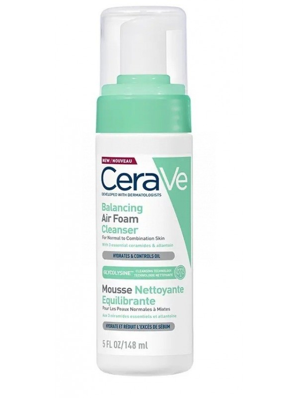El limpiador air foam reequilibrante de cerave, con 3 ceramidas esenciales y tecnología glycolysine, limpia de forma potente pero respetuosa, reequilibrando la piel y eliminando el exceso de sebo, suciedad, maquillaje e impurezas, al tiempo que mantiene la hidratación. Proporciona 24h de hidratación* y 8h oil control** para una barrera cutánea con un aspecto más saludable. Esta espuma facial limpiadora es suave y apta para todo tipo de pieles, incluidas las pieles sensibles. No contiene perfume, es no comedogénico e hipoalergénico. Reequilibra la piel mixta, aportando 8h de oil control* y 24h de hidratación** para una barrera cutánea con un aspecto más saludable. Espuma no comedogénica para una limpieza agradable y sin fricción. 8h oil control* 24h hidratación** 91% notan su piel sin sensación grasa 24h tras la limpieza*** 97% coincide en que el producto elimina eficazmente exceso de sebo, suciedad e impurezas*** *test instrumental después de 8 horas, 30 sujetos **test instrumental después de 24 horas, 27 sujetos. ***estudio 4 semanas, 78 sujetos con piel mixta. *test instrumental después de 24 horas, 27 sujetos. ** test instrumental después de 8 horas, 30 sujetos