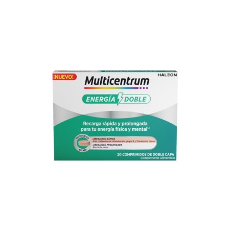 nuestro día se compone de muchas actividades y tareas a realizar (trabajar, ir al gimnasio, ir a recoger a los niños al cole, ordenar la casa, hacer la cena, vida social…). En consecuencia, el día a día puede hacerte sentir cansado e impactar tanto en tu vida personal como profesional, impidiéndote realizar todo aquello que te propones. ¡no te conformes! prueba el nuevo multicentrum energía doble. Multicentrum energía doble es un complemento alimenticio con vitaminas del grupo b, theobroma cacao y rhodiola rosea, que junto a su tecnología innovadora* ofrecen una recarga rápida y prolongada para tu energía física.