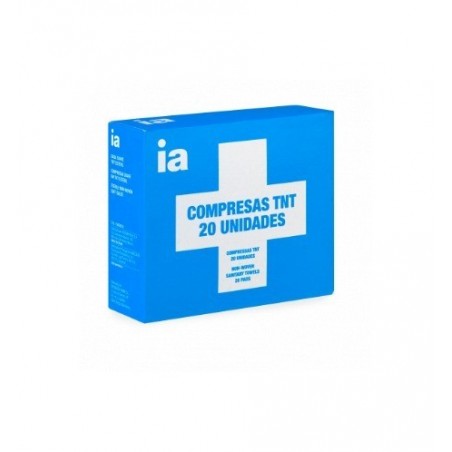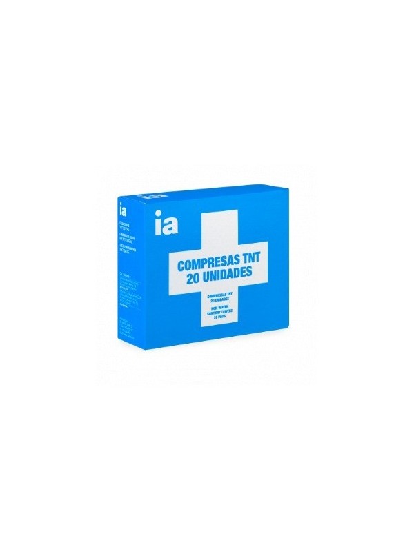 Presentación: Sobres individuales con 2 unidades de compresas de tejido no tejido, cada una de 30 gramos y medidas 20x20 cm, plegadas a 10x10 cm.